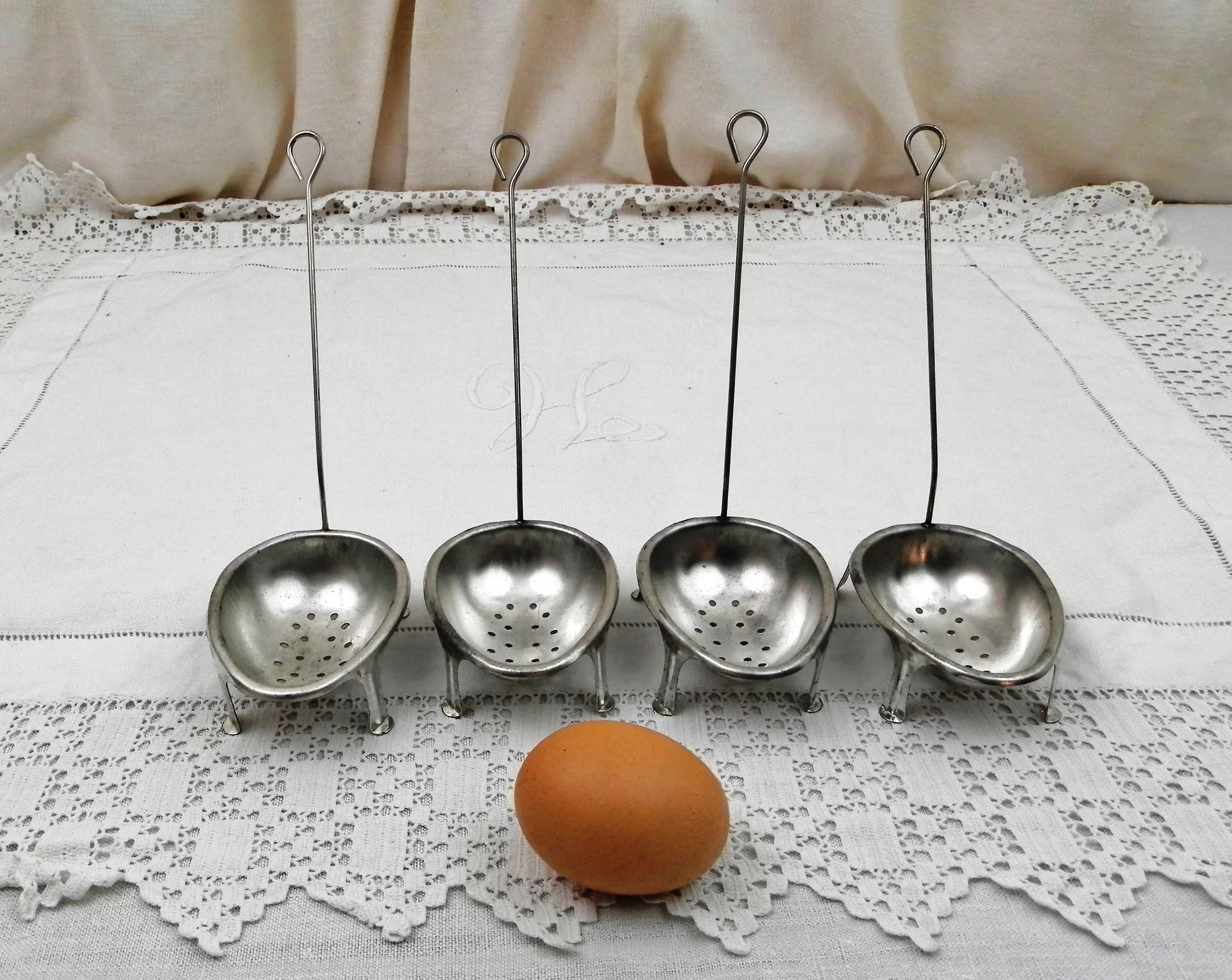 I have long used the French form for poached eggs ( I have a small army of them in my 106 boxes in Milan). They were perfected by a company in France with the name of Combrichon, and we used to carry several models in the shop. I love the neatness of the design, its perforated form and long handles that allow you to cook the eggs IN water and not steam them. The texture of poached and steamed eggs is entirely different.