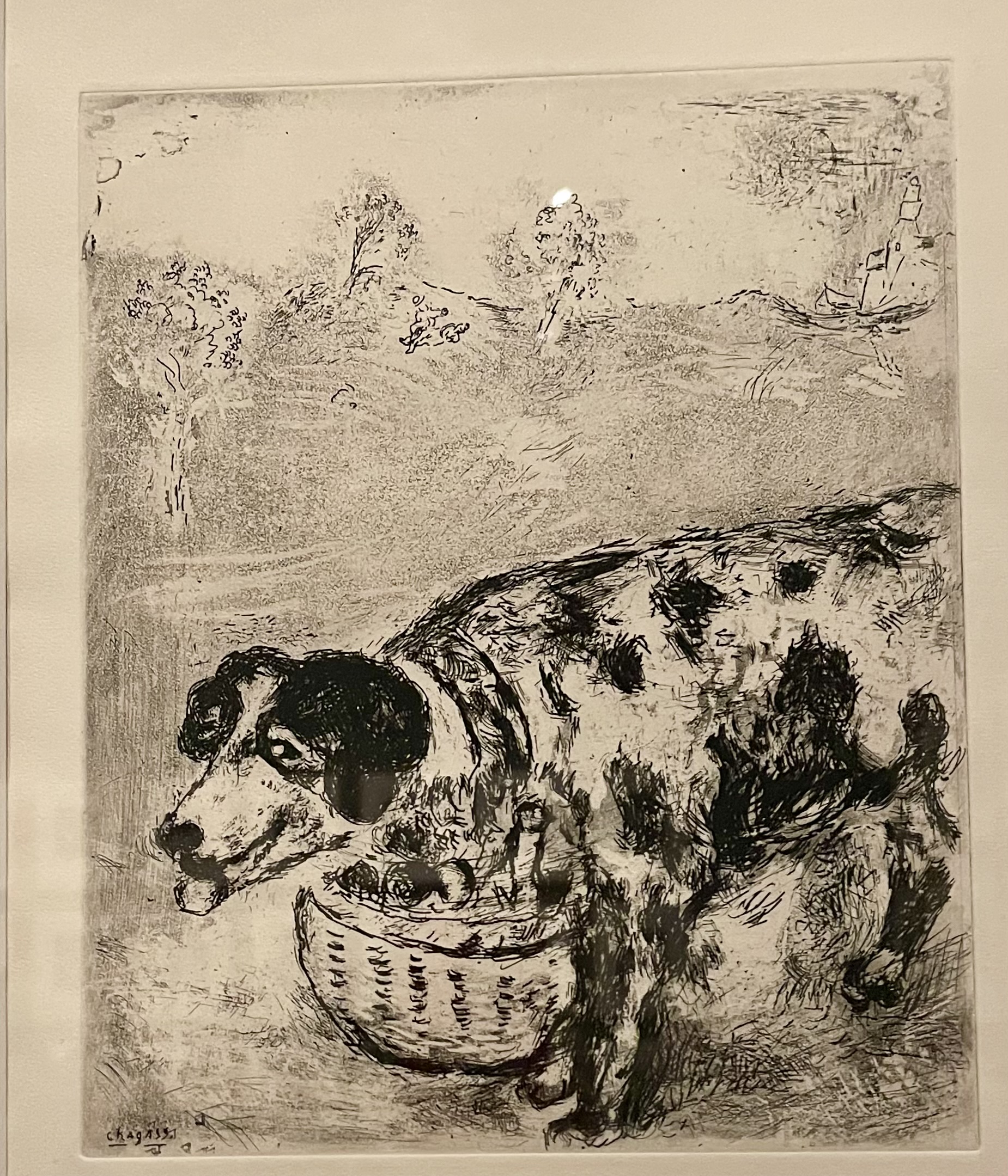 extraordinary – he made travel posters for Nice at the request of its mayor. He designed stained glass windows for cathedrals and academic centers. A publisher in Paris asked him to do illustrations for a book of La Fontaine’s Fables. They are black and white and, although I love the one of the dog carrying a basket of lunch (of course!), this extensive series does not compare with his other works.
